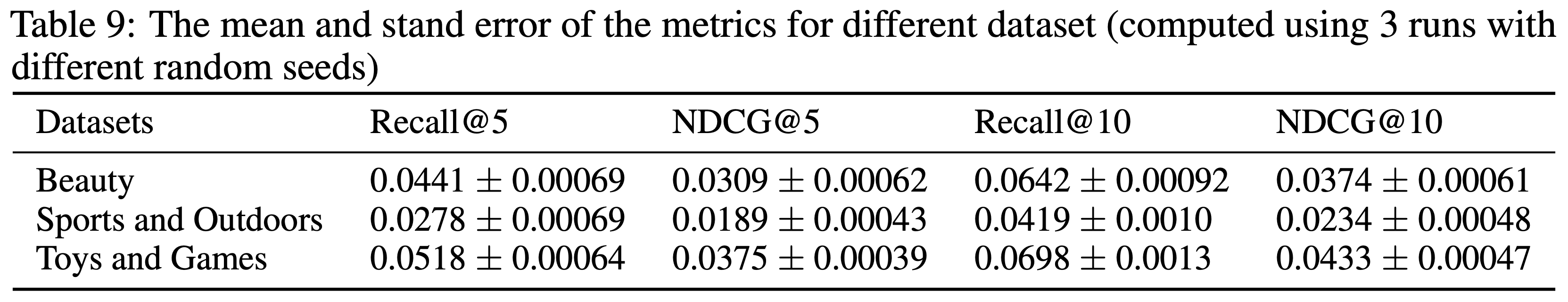 - 结果如表1所示。论文观察到,TIGER在所有三个基准上均显著优于现有基线(如表9所示,TIGER在不同数据集上的标准误差也不大(3个种子计算得到))。特别是在“美容”基准上,TIGER表现尤为突出,NDCG@5比SASRec提高了29%,Recall@5比S\(^3\)-Rec提高了17.3%。在“玩具与游戏”数据集上,TIGER的NDCG@5和NDCG@10分别提高了21%和15%